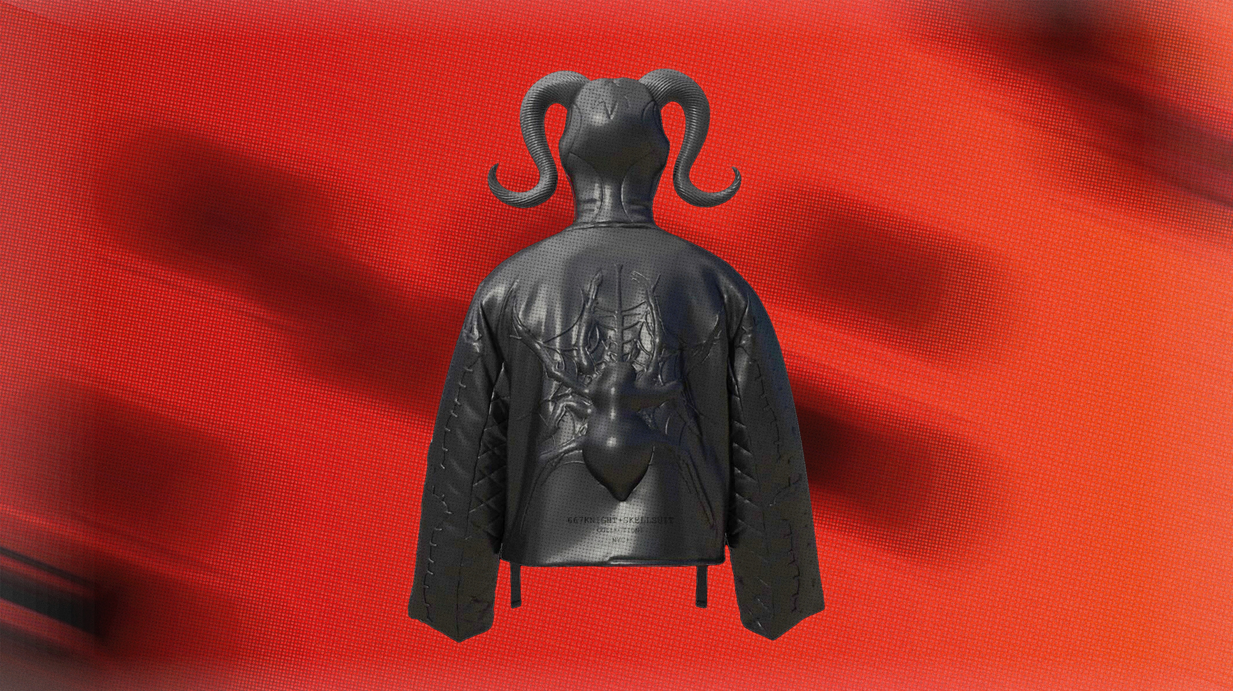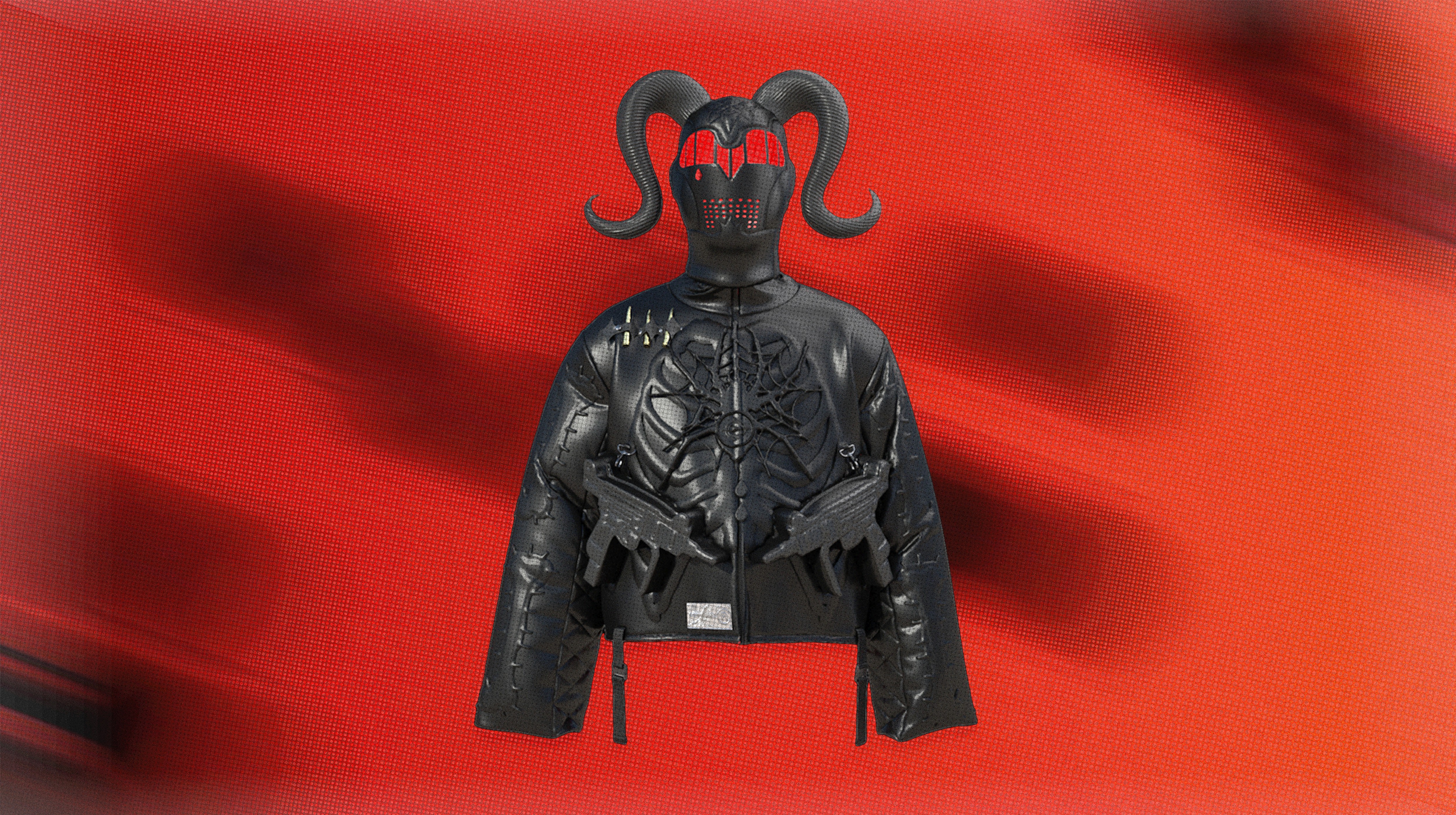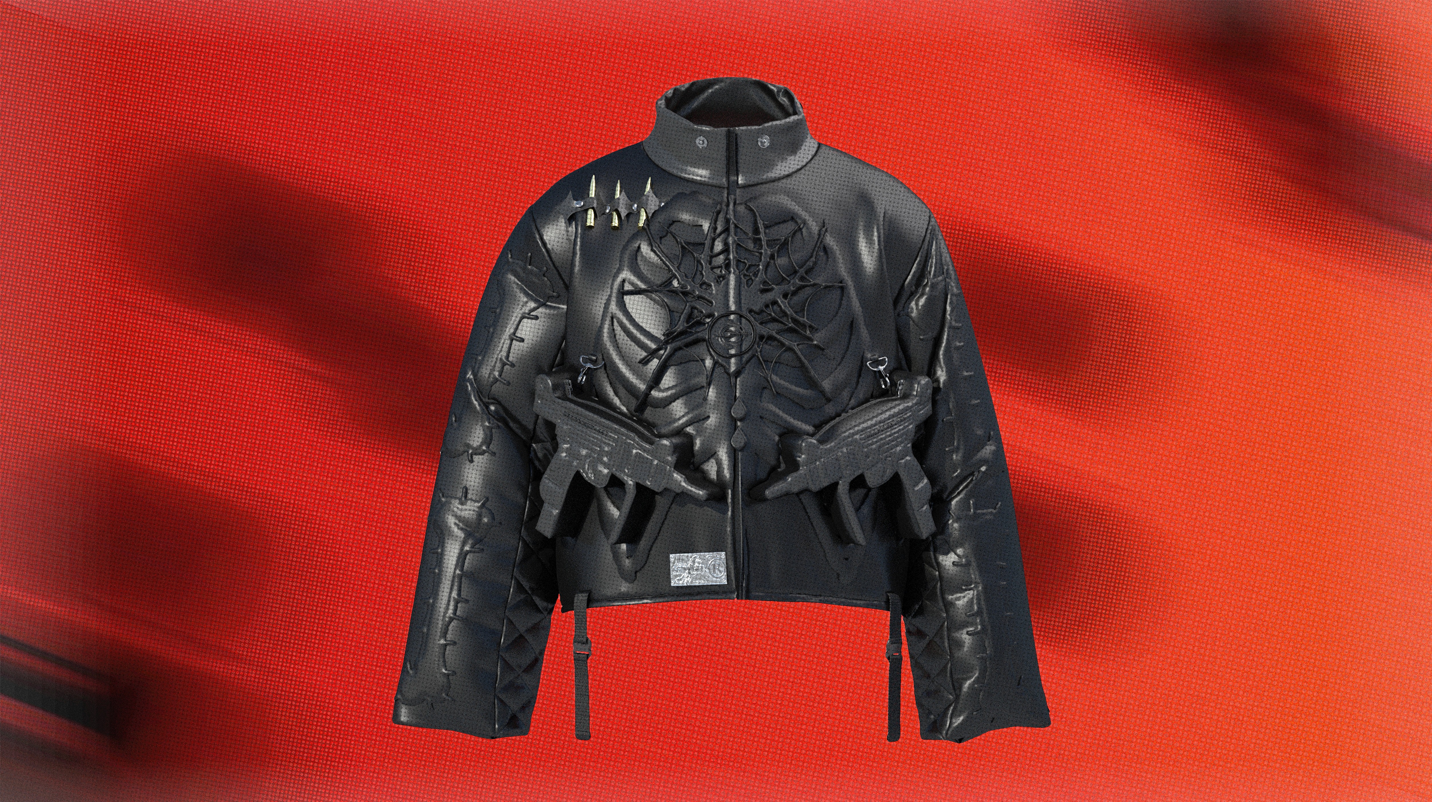 A sculptural jacket exploring the body as armor. The design features layered, anatomical detailing with matte black textures, hardware accents, and red illuminated elements that merge organic form with technology. Integrated gun forms on the front function as zippered pockets, blending utility with narrative. The piece is designed as a statement garment, balancing function, protection, and character-driven design.