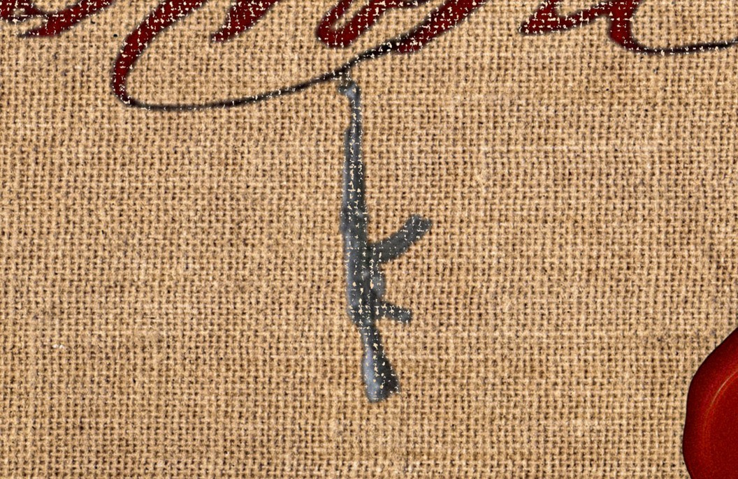 This box cover was designed to reflect contrast and tension. The sword and gun face each other to represent opposing forces—tradition versus modern violence, discipline versus chaos. The sword references history and craftsmanship, while the gun reflects contemporary power and conflict. The wax stamp acts as a seal of authenticity, drawing from old-world packaging and personal correspondence, setting the tone for the garment before it’s revealed.